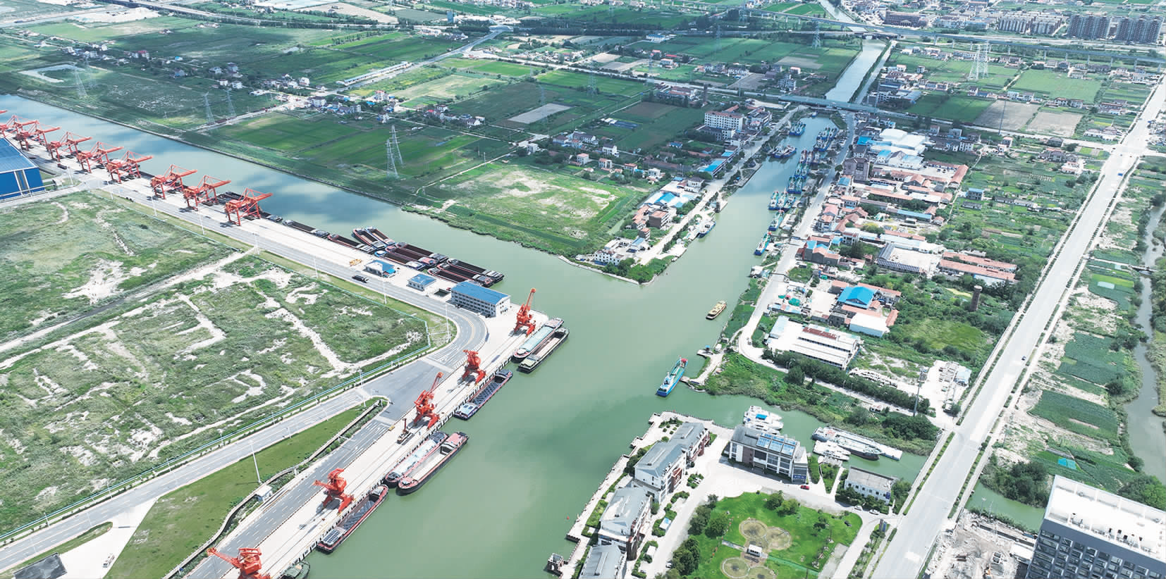 图为近日航拍的海门港经济开发区内河码头一景,码头两侧货运船和渔船来来往往,起重机装卸作业有序进行,一派繁忙景象。
