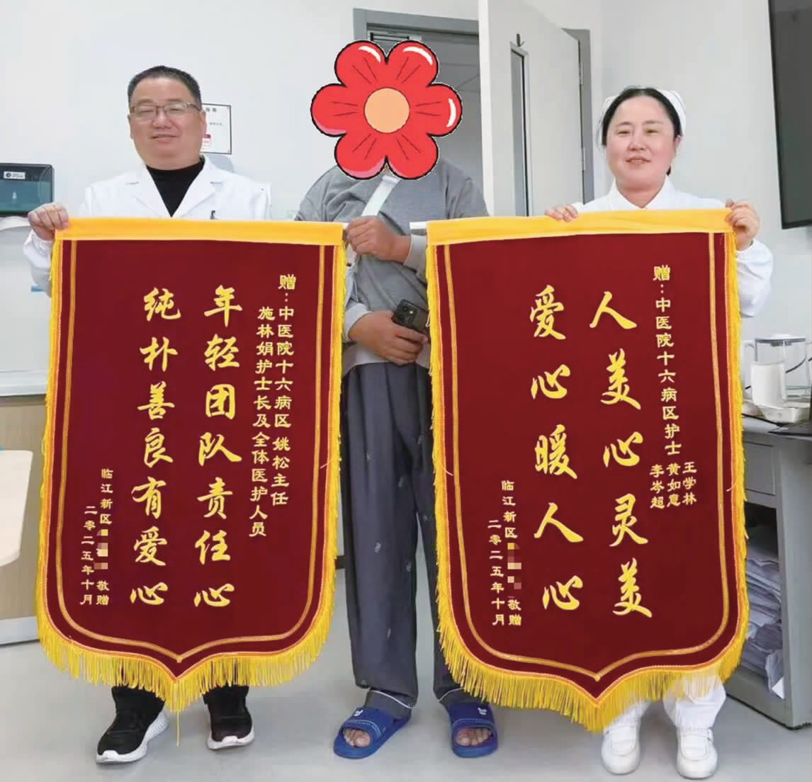 本报讯 (通讯员张玮)近日,区中医院十六病区康复科收到了一份饱含深情的“礼物”——两面来自患者黄先生的锦旗,一面上写着“年轻团队责任心,纯朴善良有爱心”,一面上写着“人美心灵美,爱心暖人心”。这不仅是患者的赞誉,更是一个关于信任与重生的佳话。