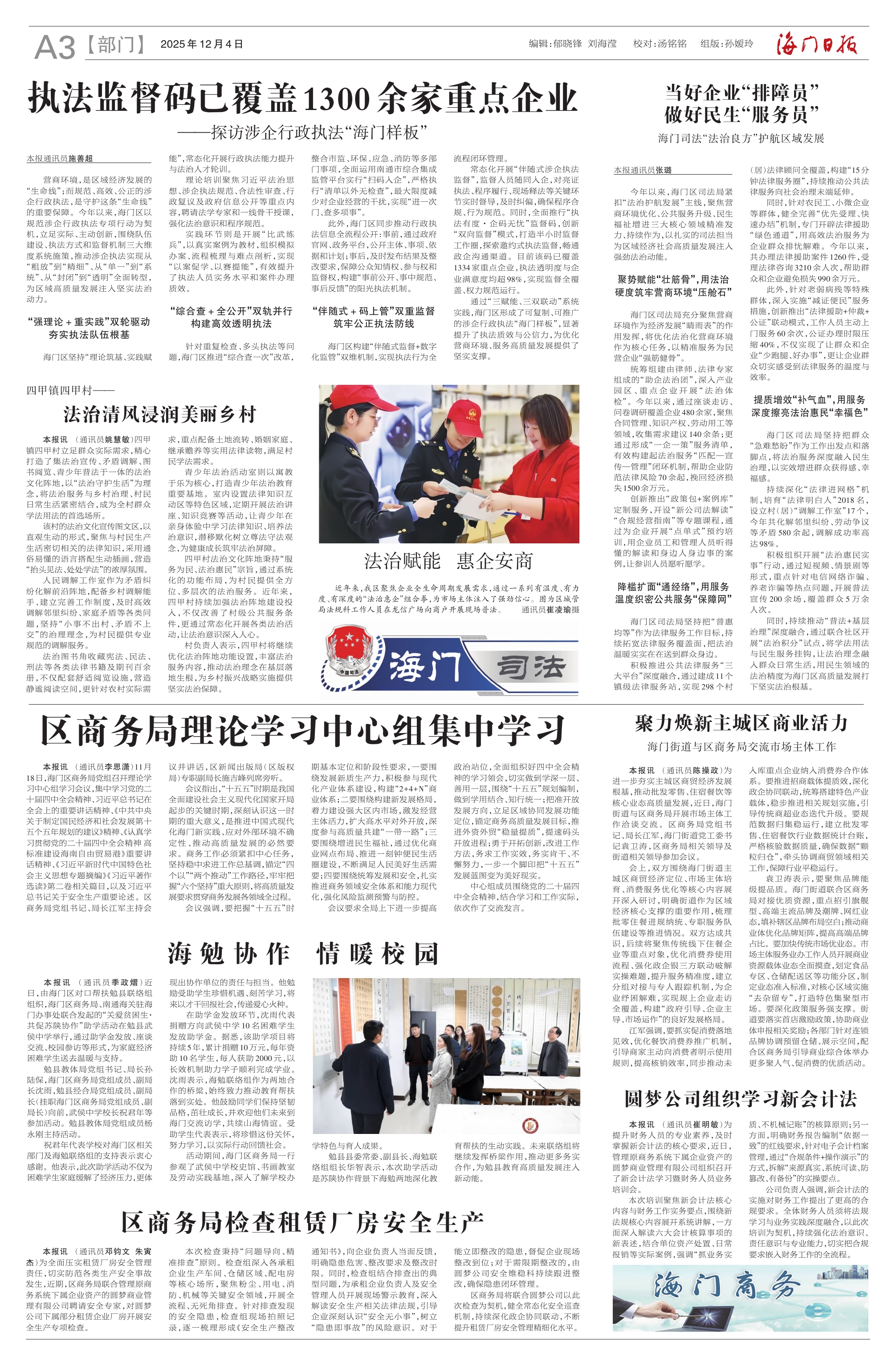 本报讯 (通讯员李思潇)11月18日,海门区商务局党组召开理论学习中心组学习会议,集中学习党的二十届四中全会精神、习近平总书记在全会上的重要讲话精神、《中共中央关于制定国民经济和社会发展第十五个五年规划的建议》精神、《认真学习贯彻党的二十届四中全会精神 高标准建设海南自由贸易港》重要讲话精神、《习近平新时代中国特色社会主义思想专题摘编》《习近平著作选读》第二卷相关篇目,以及习近平总书记关于安全生产重要论述。区商务局党组书记、局长江军主持会议并讲话,区新闻出版局(区版权局)专职副局长施吉峰列席旁听。